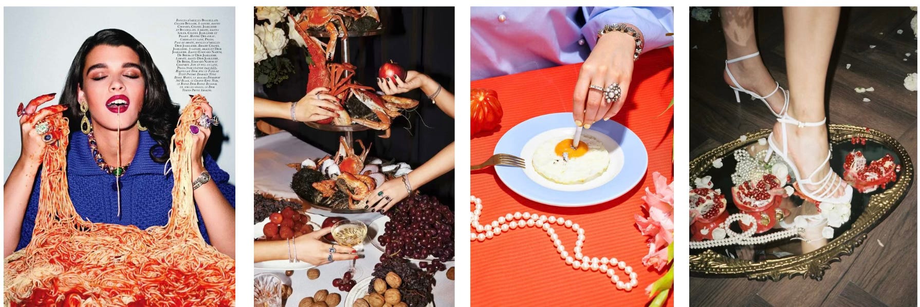 vi um TikTok muito interessante de um rapaz (que infelizmente não to encontrando! Se alguém souber qual é, me fala, pliss!) que falava exatamente sobre isso. A análise mostrava como, na moda, imagens que envolvem comida costumam girar em torno de três temas: abundância, desperdício e deterioração. Algo que, de certa forma, já vimos antes – de editoriais de revistas a campanhas de grandes marcas.
